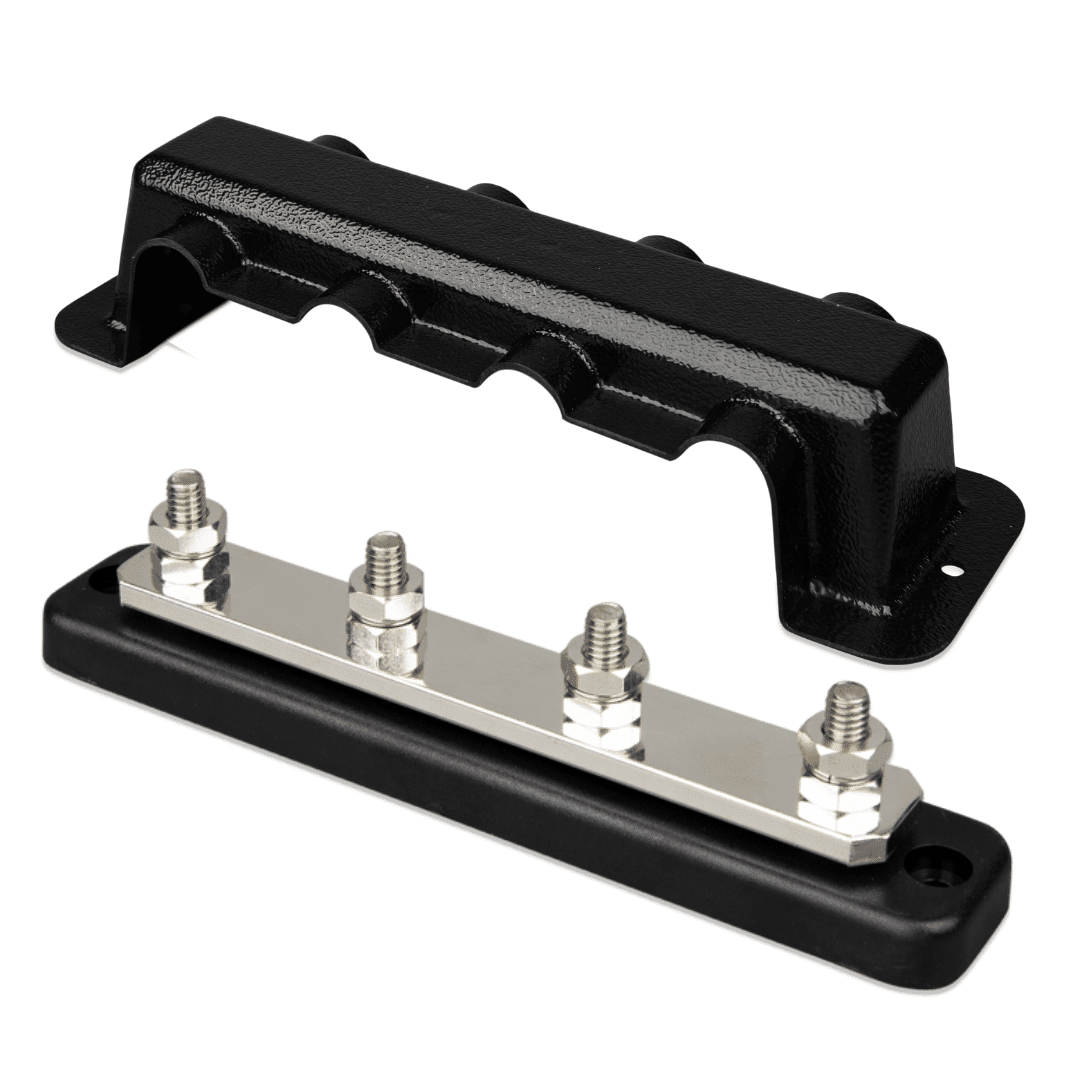 Busbars are used for high current distribution and at the same time they provide connections for batteries and/or DC equipment. Each busbar is fitted out with a removable protection cover.