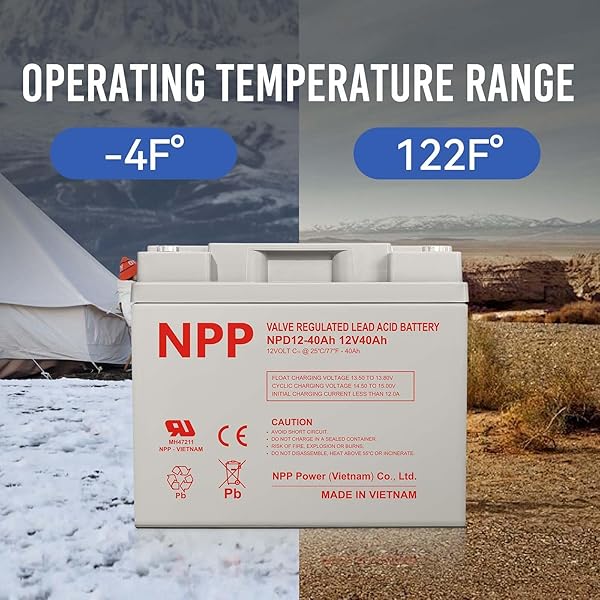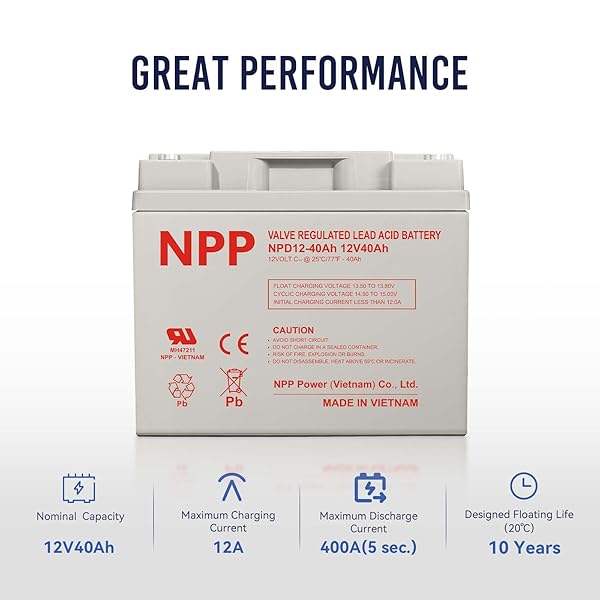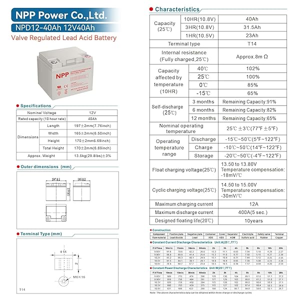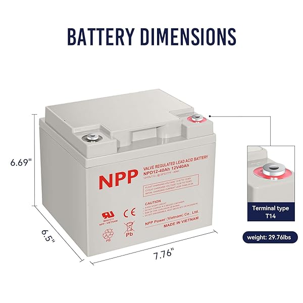 NPP Power Co., Ltd. NPP Groupis an international enterprise which is specialized in R&D, manufacturing, marketing of renewable energy products, with total investment of 150 million US dollars and three permanent manufacturing bases for lead acid battery and also has branch office located in US. NPP group is the pioneer which manufactures a full range if renewable energy products, which including VRLA Battery, Deep Cycle Battery, GEL Battery and Lithium Battery for back up, emergency system, solar system and so on. NPP Group Pay high attention to the quality control and conducts strict producing control from new material to final product, which ensure high quality of every product. If you have any query, please leave us a message. We will response promptly with satisfactory solution! FEATURES Product name: NPD12-40AH Deep Cycle Battery Model Number: NPD12-40AH Color: Grey Volatage: 12V Rated capacity : 20 hour rate Designed floating life(20℃) : 10years Terminal Type:T14 Size: 7.76 * 6.5 * 6.69 inches APPLIACTION Solar, UPS, Alarm System, Firefighting Equipment, Standby Power Supply, Uninterrupted Power Supply, Telecommunication System, Computer Standby Power Supply System, Wind Systems, RV