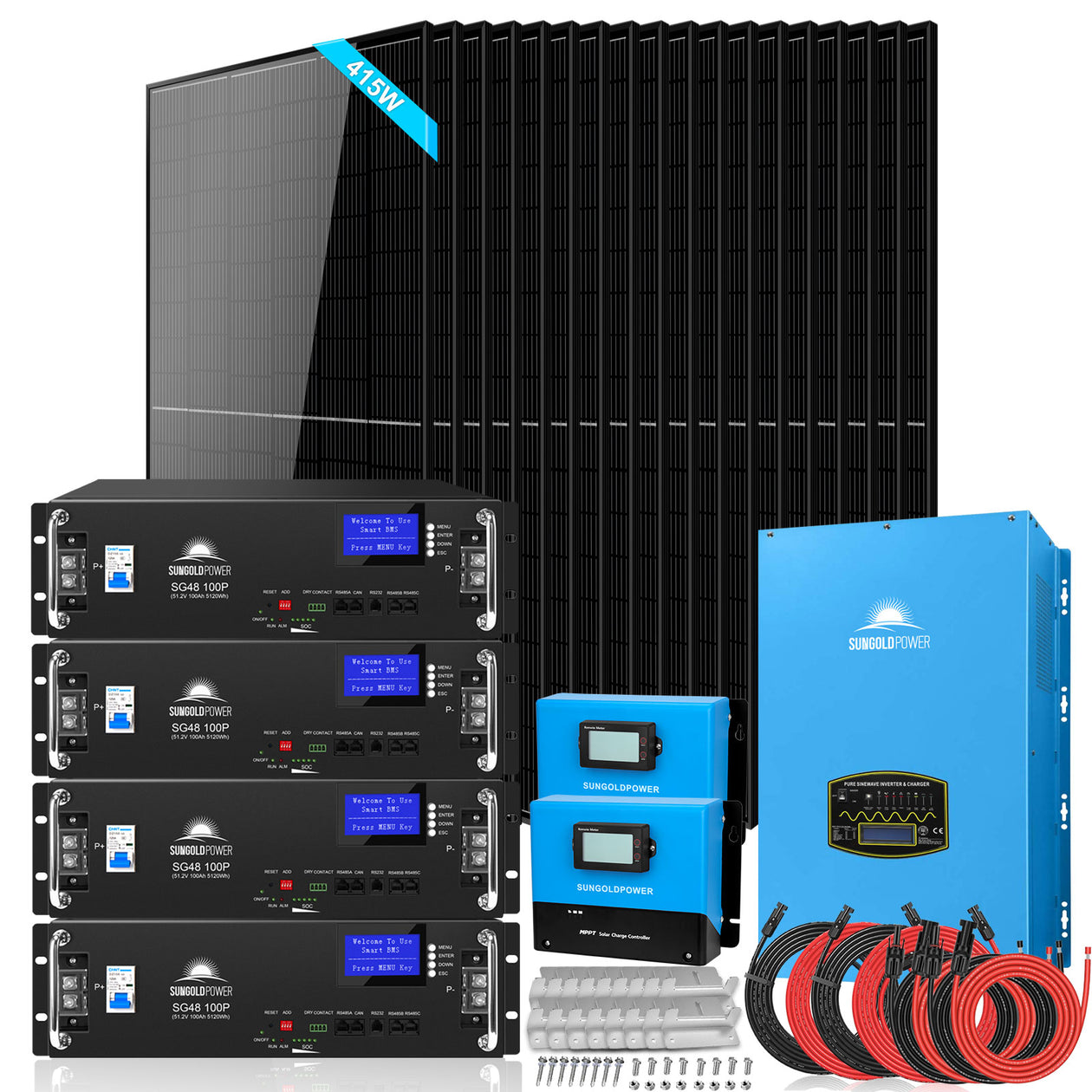 Off-Grid Solar Kit 15000W 48VDC 120V/240V LifePo4 20.48KWH Lithium Battery 18 X 415 Watts Solar Panels SGR-15K20E